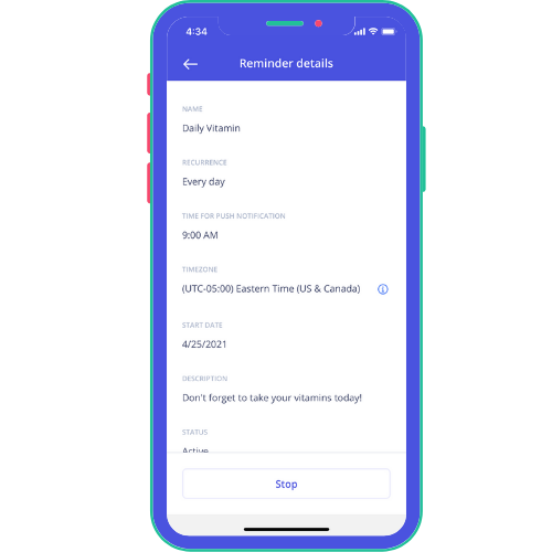 In-App Reminders Create customized recurring study reminders Participants can enable or stop reminders as needed in the app next feature ↳ ↵ back to full list of features